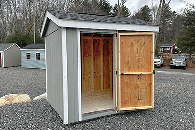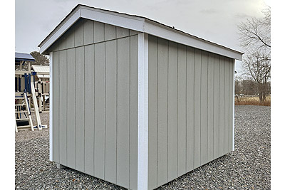 6×8 Berkshire Sudbury Shed features: 4′ ridge vent. A-frame roof. Duratemp siding painted gray with white trim.