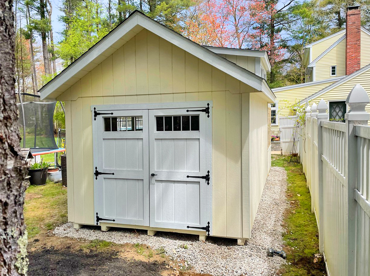 The attached 10×14 storage shed includes two screened vinyl windows, a wide 6′ double door for easy access, and a dormer accented with transom windows to enhance natural light and architectural appeal. The exterior was custom-painted to complement the home’s yellow-and-white color palette, and an 18″ Cupola with copper roof adds a polished, finished look. Before delivering the custom-built structure Outdoor Personia handled the site preparation including a level pad of crushed stone and poured 2 concrete footings for stability.