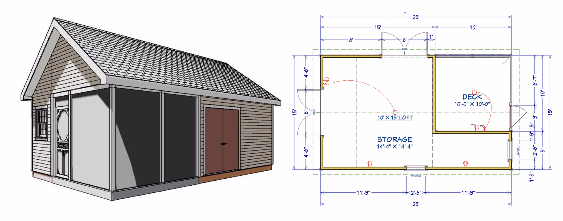 Eli was looking for a better structure for his storage needs but his family also wanted protection from bugs sitting outside on warm summer nights. He visited our Bellingham Design Center where he was hoping to find a solution to improve his backyard living space. Our shed design consultant listened to Eli’s story and then visited his Needham property to carefully examine and measure the space surrounding the house. They were able to collaborate on the perfect solution: A Custom 15×25 Trestle Shed with plenty of interior space including a 10×15 storage loft with an attached 10×10 screen-enclosed deck.