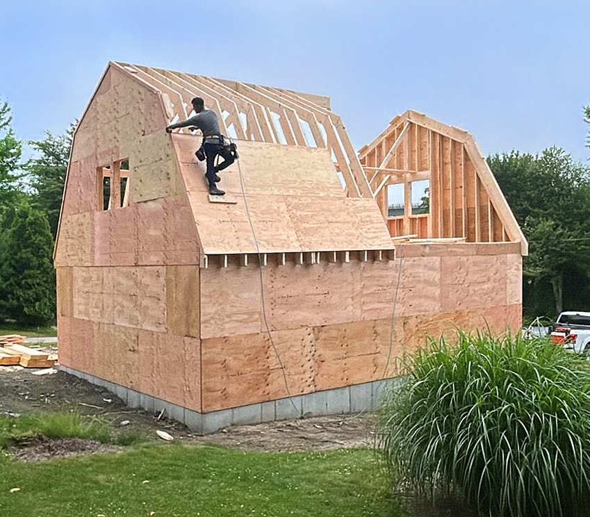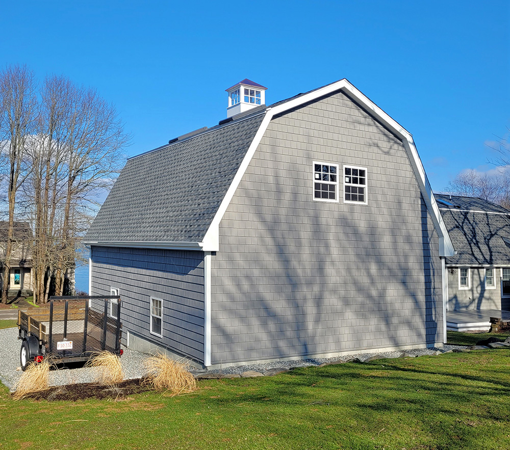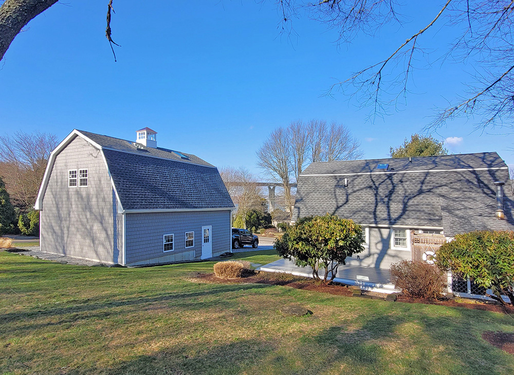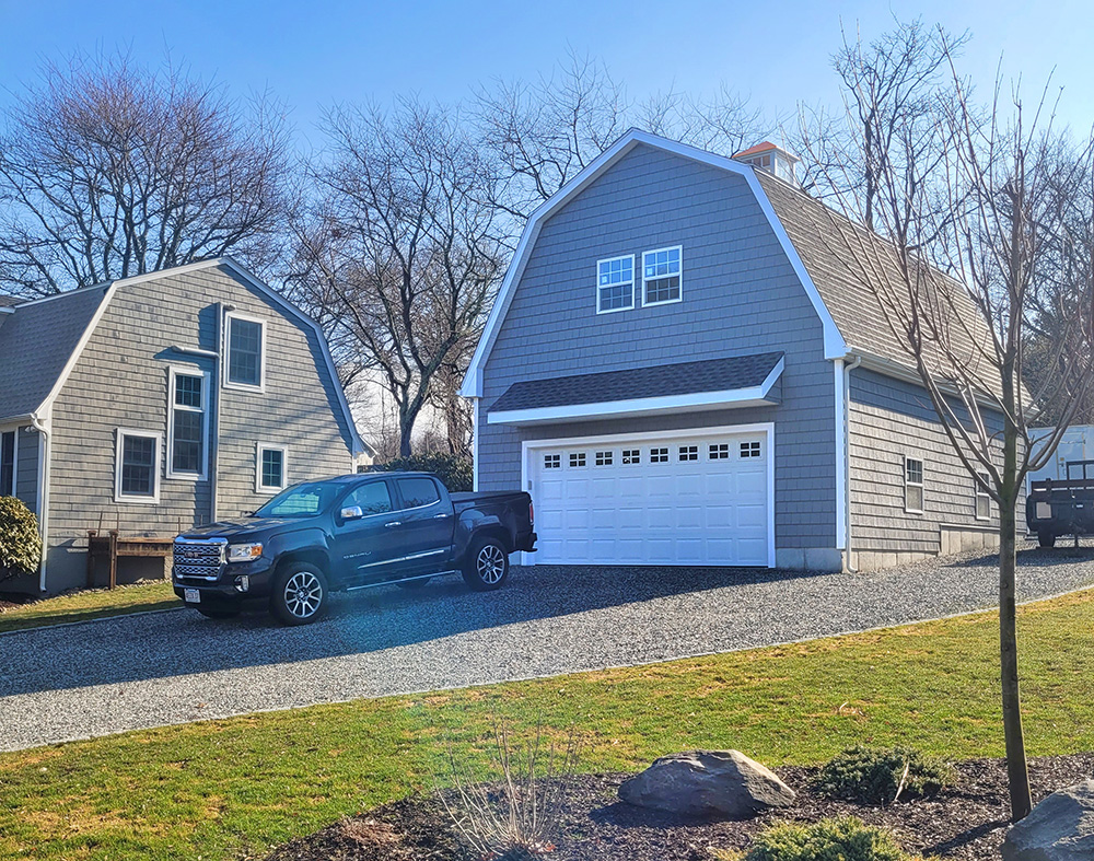 When Bob and Rebecca were downsizing and in the process of moving into their dream coastal home in Jamestown, Rhode Island. The house they chose unfortunately had no garage and very limited storage space in the backyard shed. As an auto-mechanic, Bob needed a dedicated space to store his tools & shop equipment and be able to work on cars out of the elements. The couple envisioned a custom 2-car garage that would not only provide reliable protection, but also blend seamlessly with the classic gambrel architecture of his home.