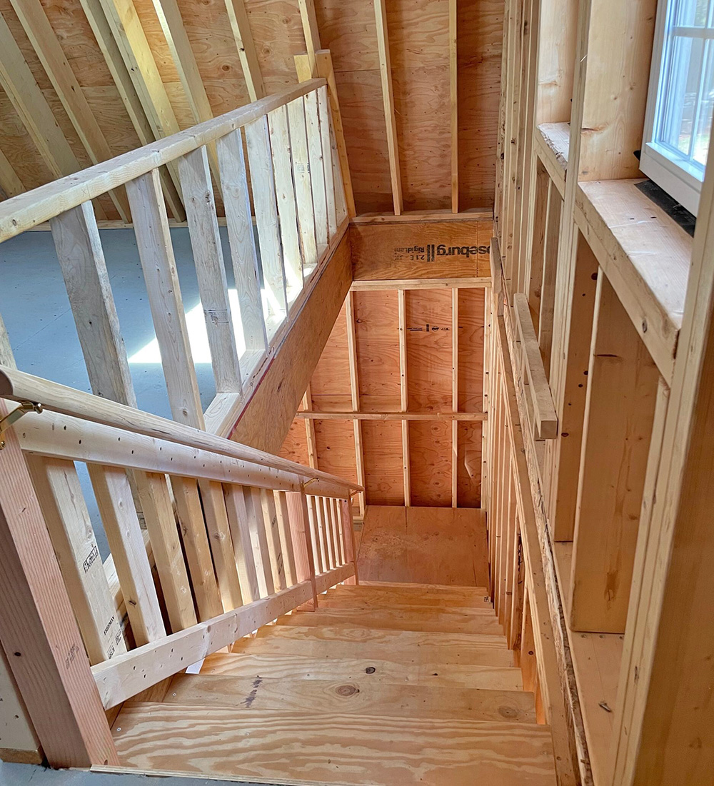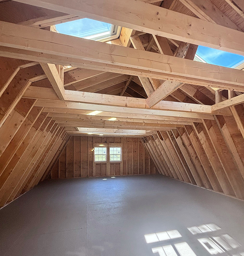 Outdoor Personia handled all the architectural drawings, permitting, and preparing the site for its foundation and structure. The finished design complements the home with a coordinated color palette, decorative vinyl shake siding, and white vinyl garage doors and windows. A raised panel entry door with transom windows adds character, while a rooftop Zephyr Custom Cupola introduces a timeless New England accent that elevates the entire property. Inside, a spacious second-story loft provides valuable storage for tools, equipment, and seasonal items while keeping the main garage floor clear for vehicles and daily use. Four skylights fill the loft with natural light, creating a bright and practical workspace.