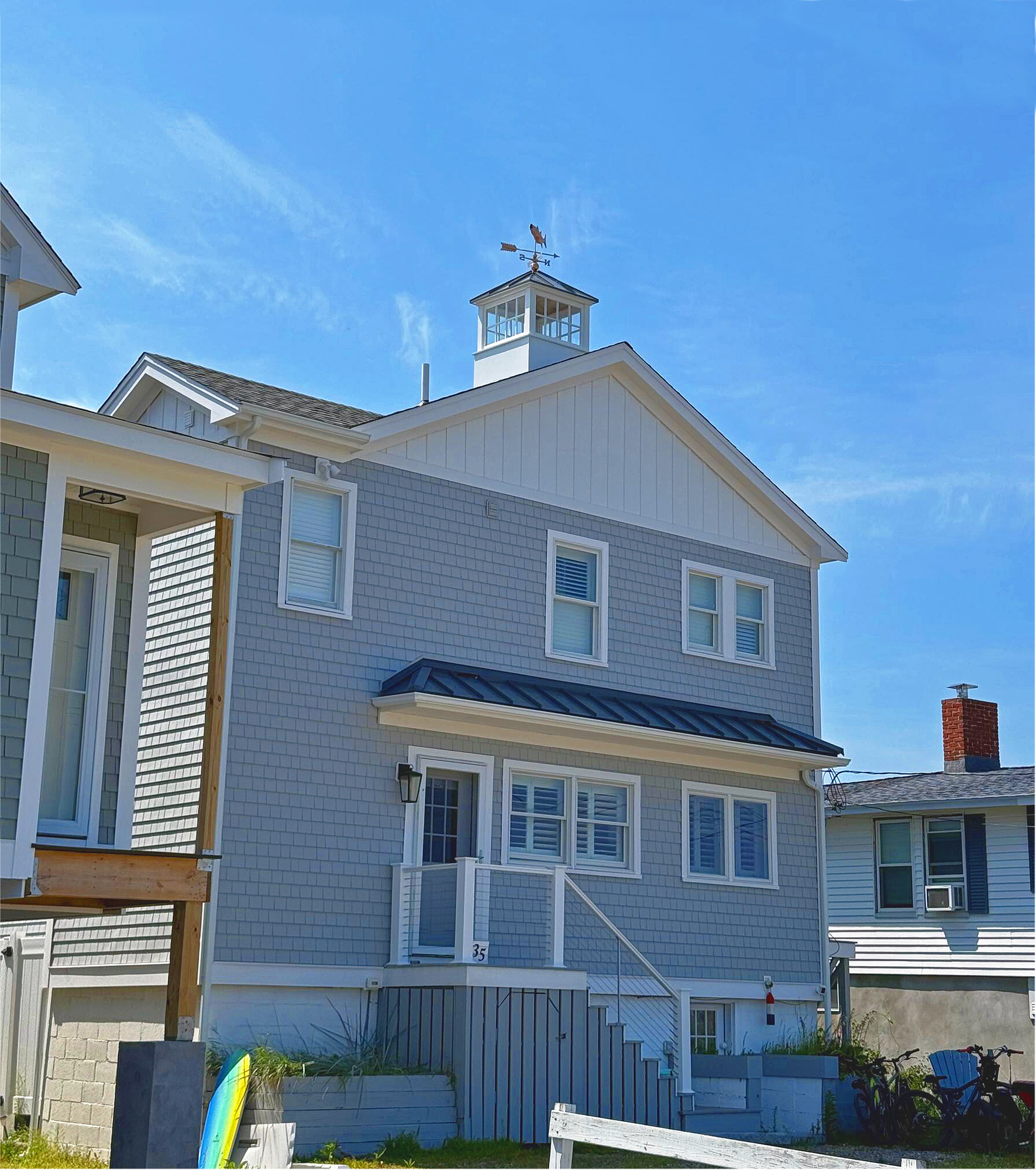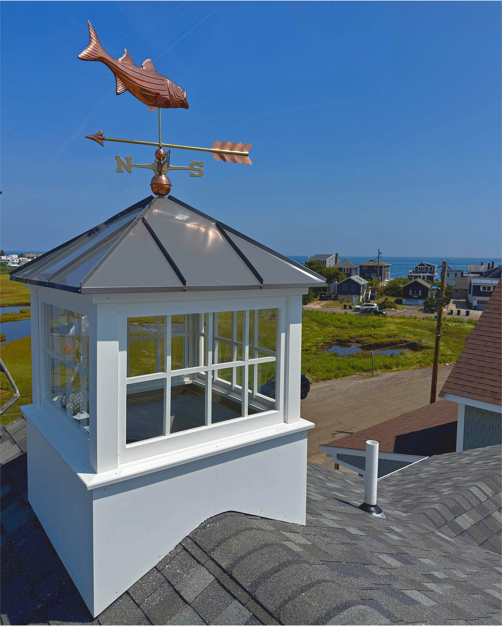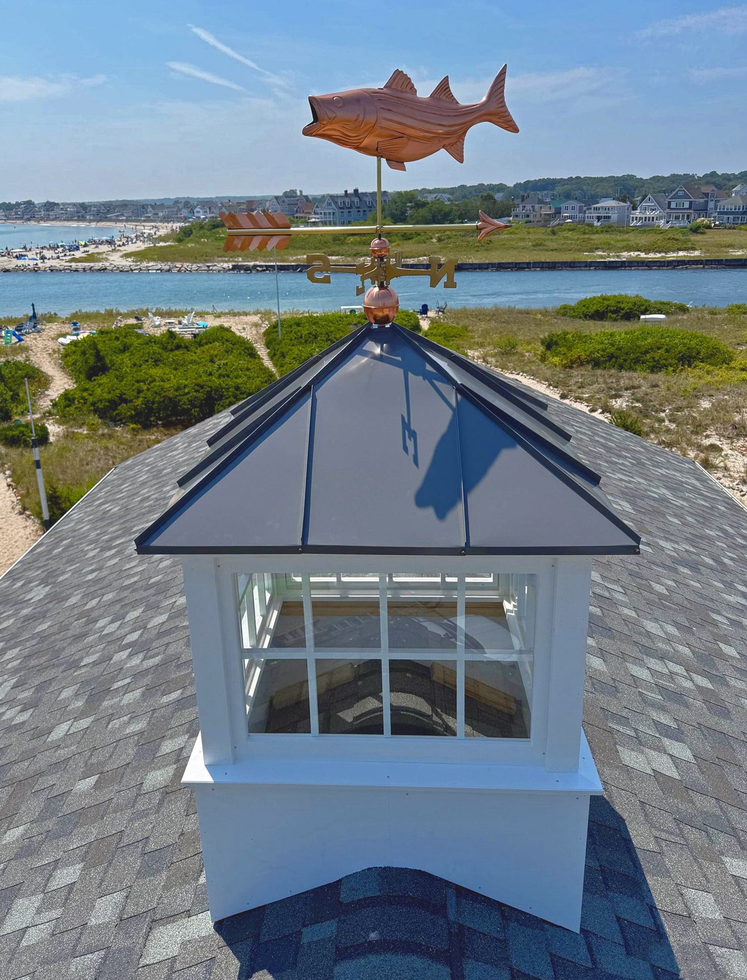 Ryan has a beautiful oceanfront home in the Brant Rock section of Marshfield, MA. He wanted to add a rooftop cupola that matched his home’s coastal style and featured the same metal roofing used on portions of his house. Ryan visited our Hanover Design Center and met with an Outdoor Personia design consultant. After discussing various styles and size options, he chose a 42″ Zephyr Custom Vinyl Cupola with eight-pane windows and a standing seam metal roof. To complete the look, he selected a Bass Copper Zephyr Weathervane – making this a fitting accent for his seaside property.